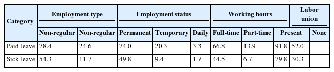 Table 2.Provision rates of paid leave and sick leave by employment type, employment status, working hours, and labor union presence (%)