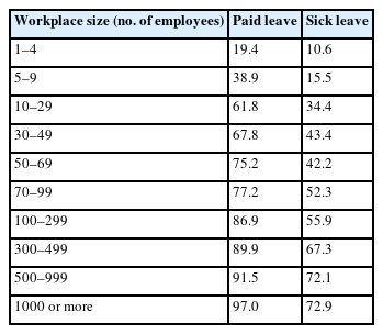 Table 3). The rate of sick leave provision for workplaces with less than five employees was 10.6%, which was one-seventh of that for workplaces with 1,000 or more employees, and only one-fourth of the overall 38.4%. As the size of the workplace increased, access to sick leave tended to increase proportionally.