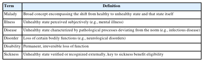 Table 1, the term “malady” refers to the shift from a healthy state to an unhealthy one, as well as the unhealthy state itself, in a broad sense. Treatment refers to the interventions that move an individual from an unhealthy to a healthy state. The concept of malady can be divided further. “Illness” refers to a subjective experience of discomfort or pain, such as that associated with mental illness. “Disease” centers on the pathological process deviating from normal physiology and is the most commonly used term in medicine. “Disorder” denotes a partial loss of the bodily function. In contrast, “sickness” indicates an unhealthy state that is publicly recognized or displayed—this term corresponds to “sickness” in the context of sickness benefits. “Disability” refers to a permanent and irreversible loss of function.