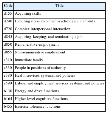 - 14. Finger ME, Escorpizo R, Glassel A, Gmunder HP, Luckenkemper M, Chan C, et al. ICF Core Set for vocational rehabilitation: results of an international consensus conference. Disabil Rehabil 2012;34(5):429–38.ArticlePubMed