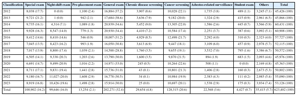 Importantly, asbestos-related disease screenings were conducted in 22,568 cases (3.6%), representing one of the few hospital-based surveillance efforts for long-latency occupational diseases in Korea. Student health screenings (4,427 cases, 0.7%) and examinations classified as 'Others' (35,415 cases, 5.7%) made up smaller proportions of the overall volume.