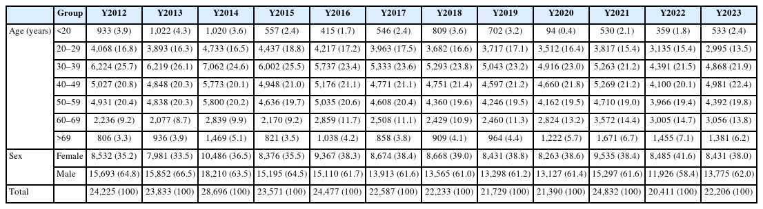 Table 2 presents the annual characteristics of participants who underwent examinations each year during the study period. The yearly distribution reflects the dynamic enrollment and re-examination pattern across years, with some participants undergoing multiple examinations while others entered or exited the cohort in different years. The proportion of participants aged under 30 decreased over time, while those aged 60 years or older gradually increased, indicating the aging structure of the cohort population. For example, participants aged under 20 accounted for 3.9% in 2012 but declined to 2.4% in 2023, whereas those aged 60–69 increased from 9.2% in 2012 to 13.8% in 2023. Sex distribution remained relatively stable, with males consistently comprising approximately 60%–65% of the annual examinees throughout the period. The total number of examinees per year ranged from approximately 20,000 to 25,000 depending on examination year, with peak volumes observed around 2014.