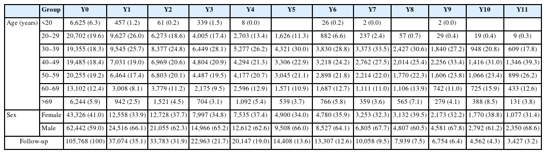 12 This cohort has a strategy of cleaning data once a year and analyzing the constructed cohort data when new research hypotheses are generated. Since this passive cohort is data-based tracking, subjects who can no longer be identified in the database during the follow-up period are defined as ‘dropouts.’