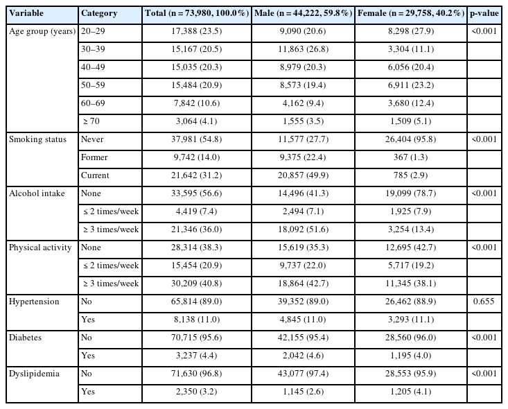 - 12. Seo JM, Lim NK, Lim JY, Park HY. Gender difference in association with socioeconomic status and incidence of metabolic syndrome in Korean adults. Korean J Obes 2016;25(4):247–54.Article
