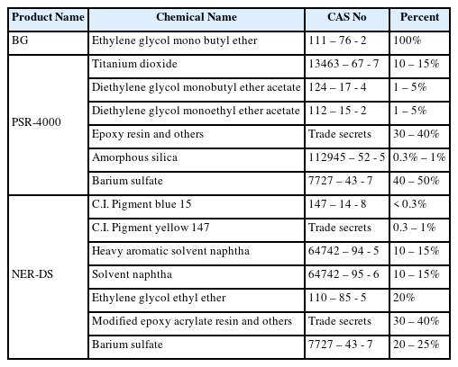 According to the identified material safety data sheets (MSDS), the main raw materials of the dye were barium sulfate, titanium dioxide, and epoxy resin. The solvents mainly consisted of heavy aromatic solvent naphtha, solvent naphtha, BE, and EE (Table