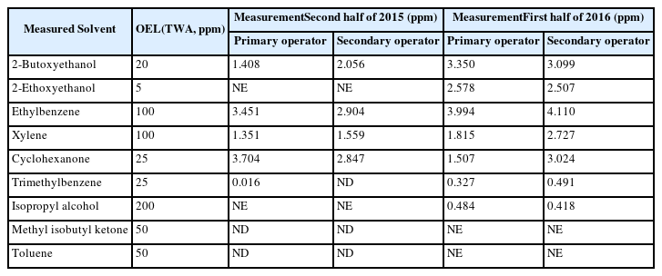 We reviewed most recent measurement results from the date of the workers’ health checkup. Trimethylbenzene, isopropyl alcohol, methyl isobutyl ketone, and toluene were detected at less than 2% of the occupational exposure limit, or were not detectable in the two workplace measurements. Ethylbenzene and xylene were found to have maximum concentrations of less than 5% of the occupational exposure limit in the two measurements of the working environment. EE had the highest concentration at 51.56% of the occupational exposure limit, while BE was measured at 16.75% and cyclohexanone at 14.82% (Table