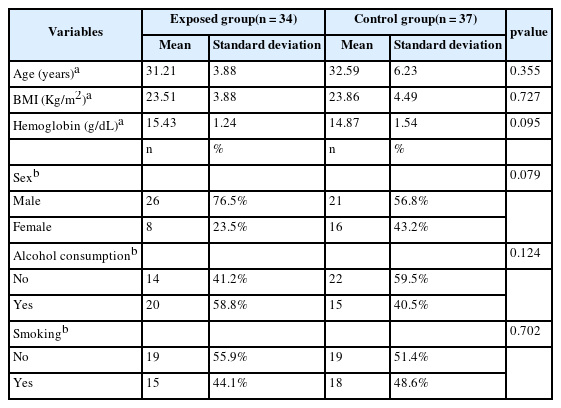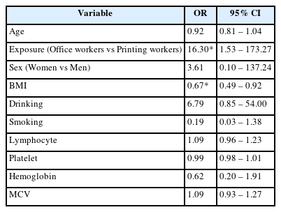 The exposure group was all 34 workers belonging to the screen-printing department at a small-sized printing firm working with fewer than 60 workers at Namdong Industrial Complex, Inchon, South Korea. They worked with dye mixing, printing, drying, and product inspection. All the workers had varied working schedules depending on circumstances, such as order quantity or work-type. Nevertheless, the exposure group usually worked 8 h a day for 5 days a week. The exposure group had the worker’s health check-up on December 5th to 7th, 2016. The exposure group included 10 foreign workers, but nationality could not be identified because no data was available. The control group samples were selected from workers who had blood examinations on November 1st to December 31st at the same health care facilities that provided regular health screening services (n = 1858). After inclusion of only those aged ≤50 years (n = 386) and individuals with no known occupational risk of solvent exposure (e.g., clerical workers including bank clerks, teachers, salespersons, and other officers), 37 clerical workers remained in the control group, and there were no foreigners.