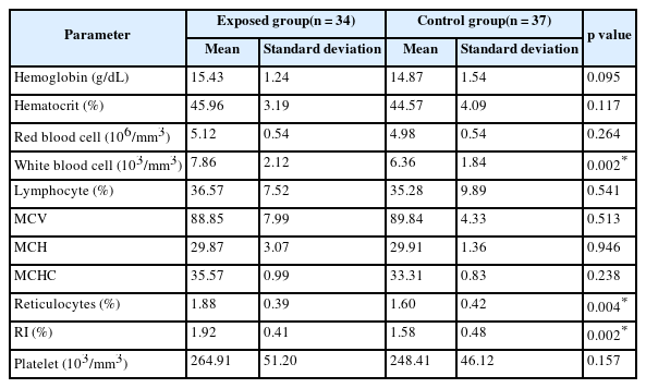 Student’s t-test and Pearson’s chi-square test were used to compare differences of hematological parameters between the exposed and control groups. In addition, a multivariate analysis was performed using the multiple logistic regression models to adjust for effective variables that were chosen by the backward elimination methods. The odds ratio (OR) and 95% confidence interval (CI) were calculated for the effect of the exposure on RI. The analysis was performed with the SPSS 18.0 statistical packet (SPSS Inc., Chicago, IL, USA). Results were considered significant when p ≤ 0.05.