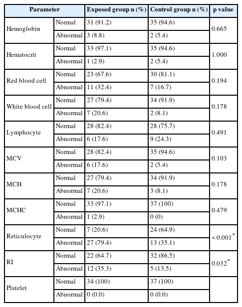 The chi-square test showed the reticulocyte percentages and corrected reticulocyte counts to be significantly higher in the exposed group. The t-tests showed a significant increase in white blood cell counts, reticulocyte percentages, and corrected reticulocyte count (i.e., reticulocyte index) in the exposed group, with p-values of 0.002, 0.004, and 0.002, respectively. Multivariate analysis showed the odds ratio for the corrected reticulocyte counts to be 16.30 for the exposed group, when compared with that of the control group.