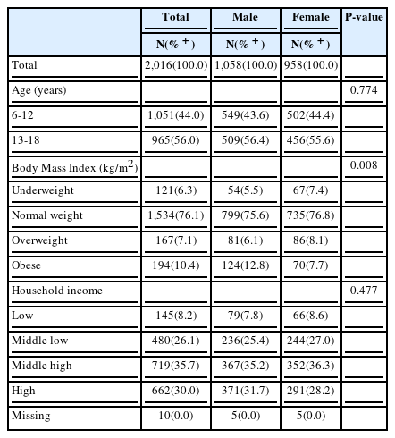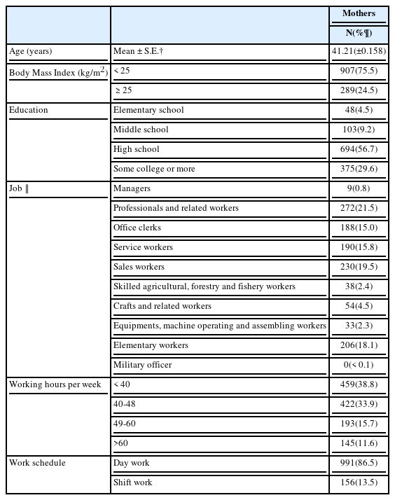 Household income was categorized into quartiles such as low, middle low, middle high and high. Mother’s education was classified into elementary school, middle school, high school and college or more. Mother’s BMI divided into 2 groups; < 25 was normal and ≥25 was obese. Mother’s occupational classification in KNHANES followed the major groups of the Korean Standard Classification of Occupations (KSCO). We reclassified them into 3 categories, which are white collars (managers, professionals and related workers, office clerks), pink collars (service and sales workers) and blue collars (skilled agricultural, forestry and fishery workers, crafts and related workers, equipments, machine operating and assembling workers, elementary workers and military officers). Status of shift work was classified into day work and shift work (all types of shift work, except day work).