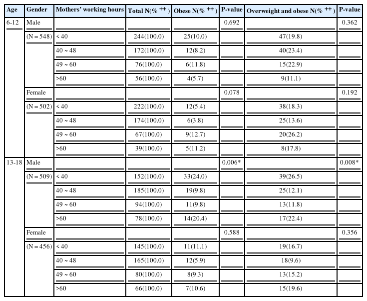 Table 3 Prevalence of children’s obesity and overweight in their mothers’ working hours per week according to age, gender