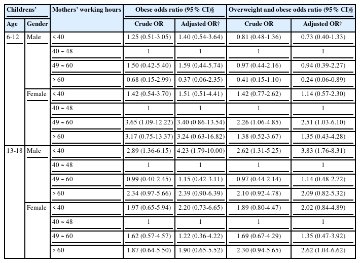 13–18 aged boys whose mothers worked under 40 hours per week were higher risk for obesity and overweight (including obesity) than 13–18 aged boys whose mothers worked 40–48 hours. 6–12 aged girls whose mothers worked 49–60 hours per week were more overweight (including obesity) than girls whose mothers worked 40–48 hours per week. 13–18 aged girls whose mothers worked over 60 hours were more overweight (including obesity) than the reference.