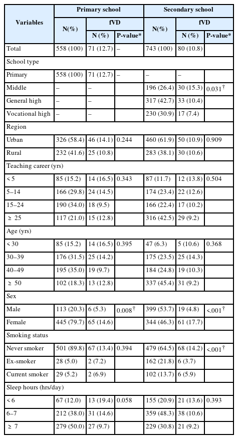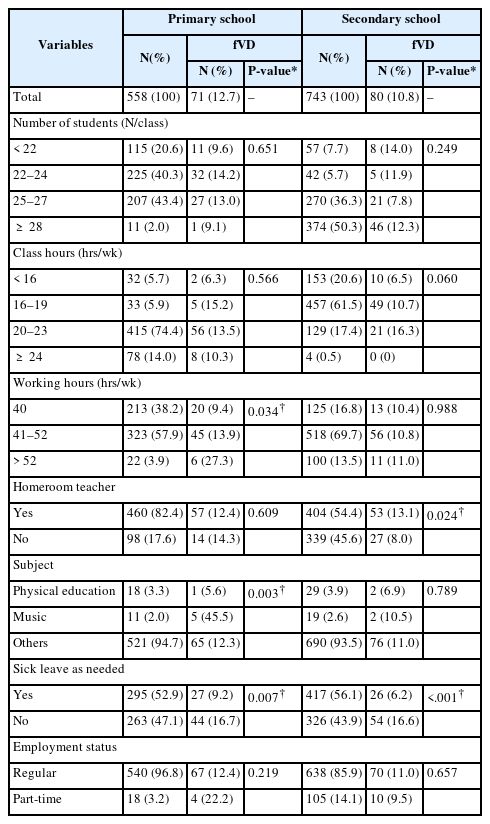 We used the t-test for the mean comparison, Pearson’s correlation to yield correlation coefficient, chi-square test for frequency comparison, and multiple logistic regression to obtain the adjusted odds ratio (aOR). Because primary and secondary school teachers differed in general characteristics and working conditions, we stratified them into two groups. The variables included in the multiple logistic regression model were as follows: variables with P-value < 0.15 for univariate analysis (sex, smoking, school type, class hours per week, working hours per week, whether they were homeroom teachers, subject taught, and sick leave as needed), and variables which are associated with VD in the previous study (age, sleep hours, and working environment). To adjust the working environment, number of students (to consider the acoustic and noise condition) and region of school were included in the multiple logistic regression model. Because there was a strong correlation between age and teaching career (r = 0.93), age was included and teaching career was excluded when performing a multiple logistic regression. The school type was included in the adjustment for secondary school teachers’ data. Smoking was excluded from the adjustment in the analysis of female teachers, and subject taught was additionally excluded in the analysis of female secondary school teachers because the number was too small to be suitable for multiple logistic regression. The current smoker number was 1 in female primary school teachers (0 with fVD) and 0 in female secondary school teachers. Among female secondary school teachers, the numbers of physical education teachers and music teachers with fVD were 0 and 2, respectively.