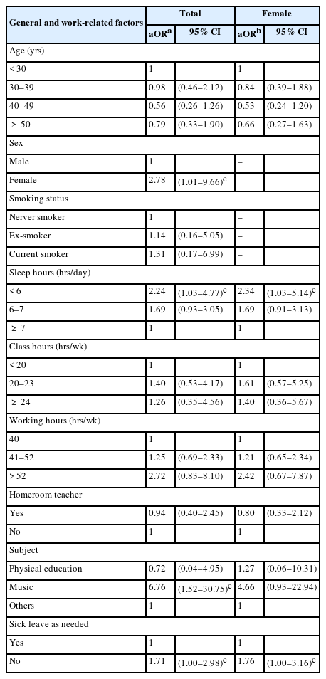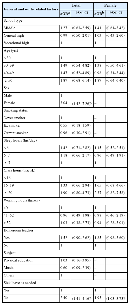 41]. In the results of the secondary school teachers, the aORs of class hours and homeroom were higher in female teachers than for all teachers, but it was not statistically significant.
