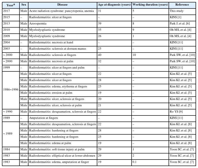 - 2. Jin YW, Jeong M, Moon K, Jo MH, Kang SK. Ionizing radiation-induced diseases in Korea. J Korean Med Sci 2010;25(Suppl):S70–S76. 10.3346/jkms.2010.25.S.S70. 21258594.ArticlePubMedPMC