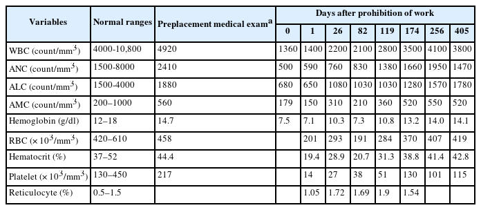 A pre-placement medical examination is a process that conducts a medical check-up on the workers who are scheduled to do a job that exposes themselves to hazards before they are assigned to the job and identifies whether there is any health problem. A pre-placement medical examination was performed on this study’s subject 6 months before the accident pursuant to the Occupational Safety and Health Act. As a result, it was demonstrated from a blood test that all parameters were in the normal range and the subject was healthy before the accident. Accordingly, it served as definitive evidence proving that the subject’s pancytopenia was an acute health effect from the radiation exposure accident. This is a case where a pre-placement medical examination, which is mandatory, was effective for the healthcare of a worker. Had a pre-placement medical examination not been provided, it would have been difficult to identify whether the patient’s pancytopenia was a personal or occupational disease.