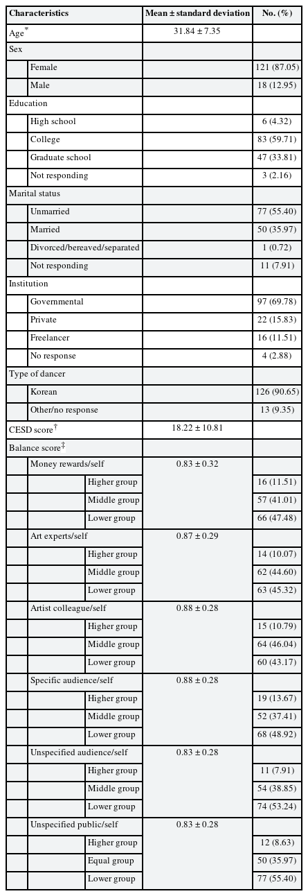 Participants were recruited by 6 professional artists who had graduated from Sookmyung Women's University. Each professional artist distributed the questionnaire to their colleagues. In total, self-reported questionnaires from 150 dance artists were collected from 1 July 2017 to 30 August 2017. Among the potential participants, 1) 16 participants with missing values of sex, Center for Epidemiologic Studies Depression (CESD), and balance score (social identity and self-identity), 2) 2 participants with no experience of performance art on stage, and 3) 3 participants whose scores showed 3 standard deviation from the mean of the balance score were excluded. Finally, data of 139 participants were used in the current study.