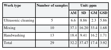 The exposure level of 1,2-DCP in the air was the highest in the mixing work type (geometric mean [GM] = 33.4 ppm, geometric standard deviation [GSD] = 1.68), and the GM concentration at handwashing was 16.2 ppm, and ultrasonic cleaning at 2.3 ppm. (Table 1).