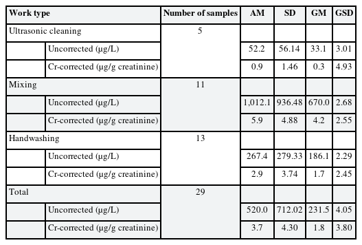 The concentrations of 1,2-DCP in urine (uncorrected and creatinine-corrected) by work type are summarized in Table 2. The distribution of 1,2-DCP concentration in urine are lognormal distribution (W = 0.984) and the GM (GSD) was 231.6 (4.05) µg/L.