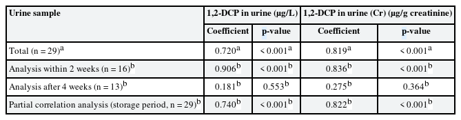 As the distribution of 1,2-DCP concentration in urine is right-skewed, log-transformation was performed so that data were normally distributed. The concentration of 1,2-DCP in urine (uncorrected, unit: µg/L and creatinine-corrected, unit: µg/g creatinine) was used to compare the degree of correlation. In addition, samples were divided according to duration from urine sampling to analysis: those analyzed within 2 weeks and those analyzed after 4 weeks.