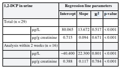 Table 4 Simple regression analysis of 1,2-DCP in air and urine after work (total and samples analyzed within 2 weeks)