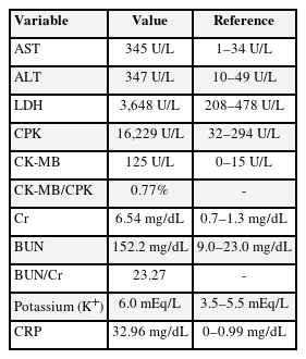 AST: aspartate transaminase; ALT: alanine aminotransferase; LDH: lactate dehydrogenase; CPK: creatinine phosphokinase; CK-MB: creatine kinase MB; Cr: creatinine; BUN: blood urea nitrogen; CRP: C-reactive protein.