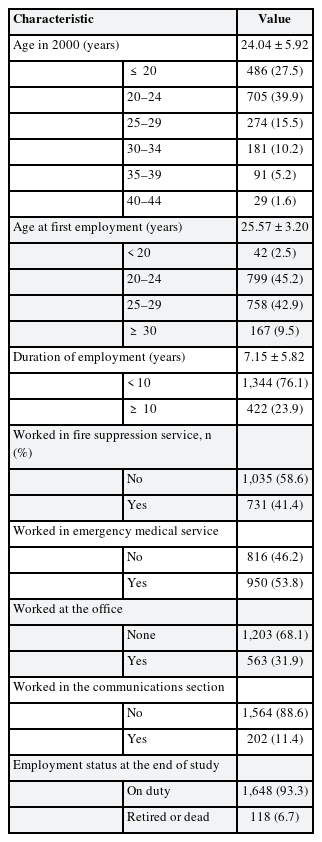 A total of 1,766 female firefighters aged < 45 years (childbearing age) at the start of the study and employed by the Korean National Emergency Management Agency (NEMA) during the study period (from January 1, 2000 to December 31, 2008) were enrolled and fully investigated.