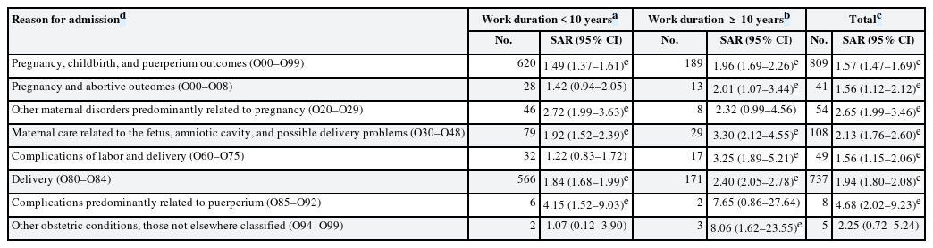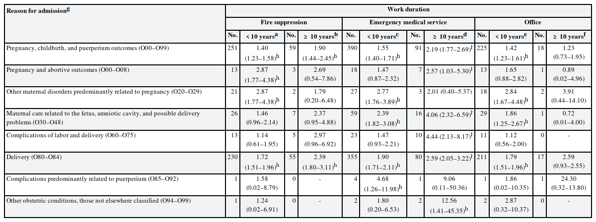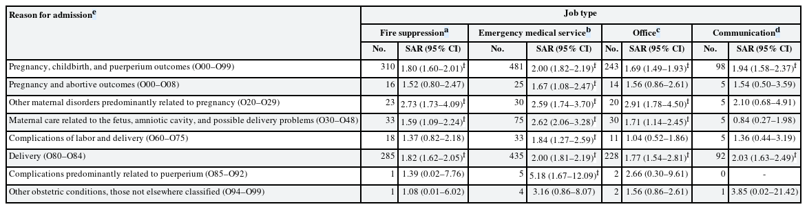 The study population included 1,766 female firefighters. Total follow-up duration was 9,659 person-years. Compared to the general female population, the female firefighters' SARs were higher in all admissions for PCPOs (SAR, 1.92; 95% CI: 1.79–2.05); pregnancy and abortive outcomes (SAR, 1.56; 95% CI: 1.12–2.12); other maternal disorders predominantly related to pregnancy (SAR, 2.65; 95% CI: 1.99–3.46); maternal care related to the fetus, amniotic cavity, and possible delivery problems (SAR, 2.13; 95% CI: 1.74–2.57); labor and delivery complications (SAR, 1.55; 95% CI: 1.15–2.06); delivery (SAR, 1.94; 95% CI: 1.80–2.08); and complications predominantly related to puerperium (SAR, 4.68; 95% CI: 2.02–9.23).