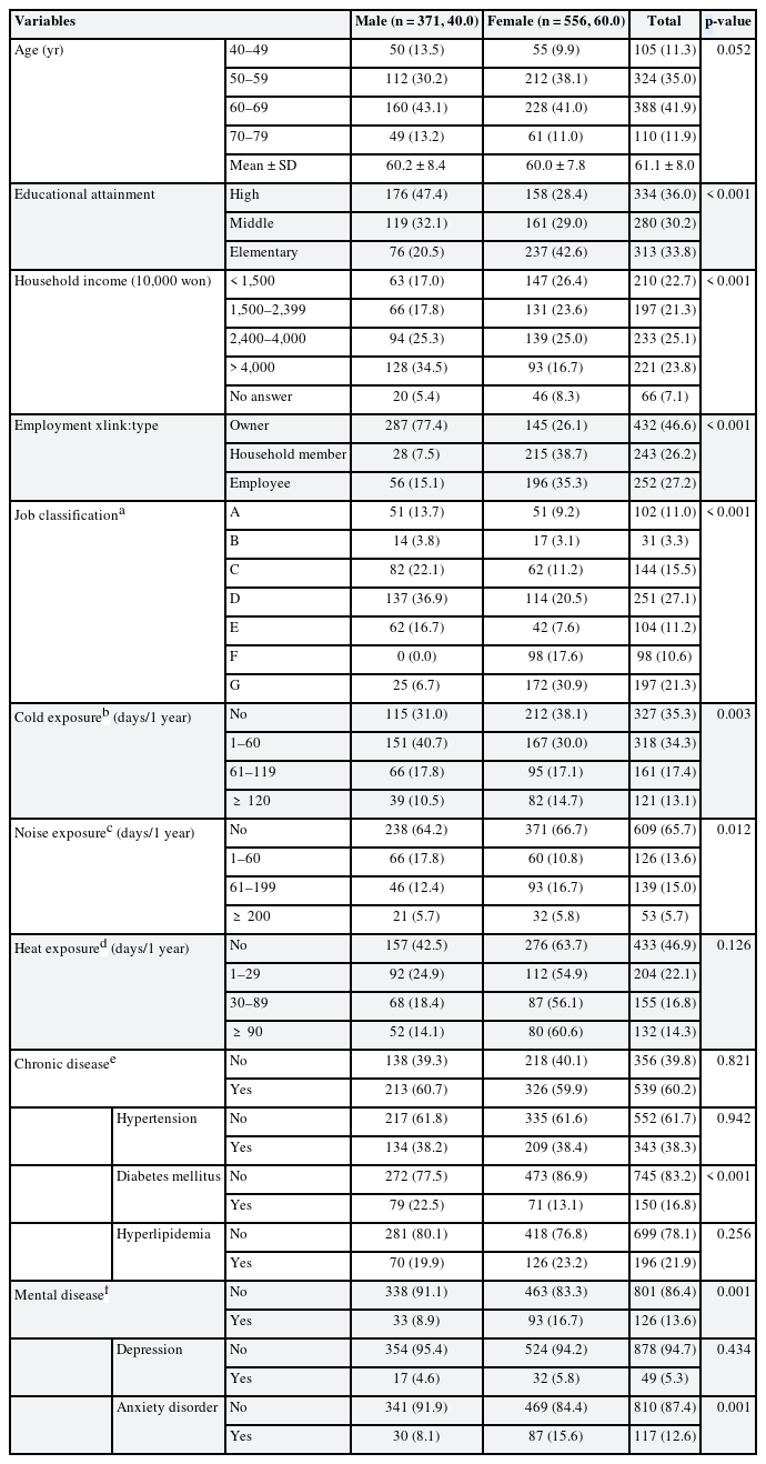 Table 1 shows the characteristics of the study subjects. A total of 927 subjects (mean age: 61.1, standard deviation: 8.0 years, with no significant difference by sex), 371 (40%) male, and 556 (60%) female were included in this analysis. By sex, there was a statistically significant difference in educational attainment, highest among high school male (47.4%) and elementary school female (42.6%); household income, with the highest of 40 million won among male (34.5%) than female (16.7%); employment xlink:type, highest among male owners (77.4%) and female household members (38.7%); and by job classification, Haenyeo were all female while the female proportion among oyster shucker was 87.3%. In the hazardous working environment, males are more exposed to cold (69.0%), heat (57.5%), and noise (35.8%) than their female counterparts. By sex, male and female differed significantly in diabetes mellitus (22.5% vs. 13.1%) and depression prevalence (8.9% vs. 16.7%), respectively.