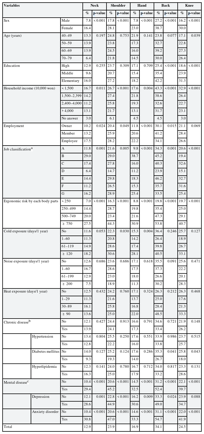 Data were collected through a questionnaire and medical examination. The dependent variable, MSD in 5 body parts (the neck, shoulders, hands, back, and knees), was defined as an experience of pain of > 1 week or > 1 per month, moderate pain intensity or higher, and an experience of medical care during the past 1 year using the musculoskeletal symptom questionnaire developed by the Korea Occupational Safety and Health Agency (KOSHA).10 Independent variables included sex, age, household income, employment xlink:type, job classification, cold exposure,11 noise exposure,11 heat exposure,11 ergonomic risk in the 5 body parts, mental disease (depression, anxiety) obtained by questionnaire (Supplementary Table 1), and chronic diseases (hypertension, diabetes mellitus, hyperlipidemia) obtained by medical examination and medication history. Household income was divided into quartiles. Employment was divided into owner (self-employed), owner’s household members, and employees. Cold, heat, and noise exposure were divided into either no exposure or 3 additional categories by counting the number of days of > 2 hours daily exposure, over the past year (Supplementary Data 1). Job classification were as follows: aquaculture (shellfish, fish, and seaweeds); and fishing vessel fishery (with trap gill net, long line, Haenyeo [Korean female sea divers], and oyster shucker). For comparison between job classifications, aquaculture (shellfish), with a higher income level and fishery mechanization rate, was used as the reference. Depression was defined using Patient Health Questionaire-9 (cut-off point 10).12 Anxiety disorder was defined using the Generalized Anxiety Disorder 7-item (cut-off point 6).13 Ergonomic risk was investigated using a structured face-to-face questionnaire. Ergonomic risk factors composed of the intensity of the task, average daily working hours, and number of working days during the recent year. We identified ergonomic risk for each of 5 body parts (the neck, shoulders, hands, back, knees). A total ergonomic risk score was calculated by the following formula: A Score (point) = The Intensity of the Task (mild = 0.5, moderate = 1.0, severe = 1.5) × Average Daily Working Hours (< 2 hours = 1, 2–3 hours = 2, 4–5 hours = 3, 6–7 hours = 4, ≥ 8 hours = 5) × number of working days during the recent year. A score of ≥ 250 was defined as a significant musculoskeletal burden task. A 250-point score implies that the fishers had continuously performed an average of 2 hours of work per day for the last year. Hypertension was defined based on a systolic blood pressure ≥ 140 mmHg or diastolic blood pressure ≥ 90 mmHg. Diabetes mellitus was defined based on hemoglobin A1c ≥ 6.5% or fasting blood glucose ≥ 126 mg/dL. Hyperlipidemia was defined based on a low-density lipoprotein cholesterol level ≥ 150 mg/dL or triglyceride ≥ 500 mg/dL or total cholesterol minus high-density lipoprotein ≥ 190 mg/dL. Patients with hypertension, diabetes mellitus, and hyperlipidemia included those who had been on medications.