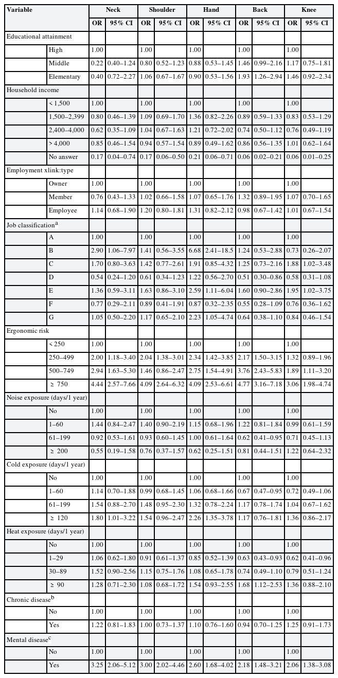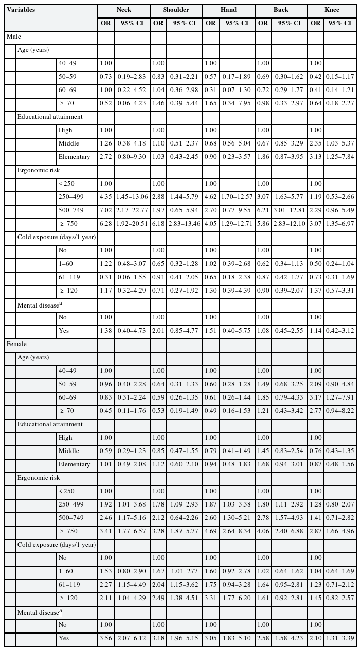 This cross-section study included 927 fishers (male, 371; female, 556) aged 40 to 79 years who were enrolled from 3 fishery safety and health centers. The outcome variable was one-year prevalence of MSD in 5 body parts (the neck, shoulder, hand, back, and knee). Independent variables were sex, age, educational attainment, household income, job classification, employment xlink:type, hazardous working environment (cold, heat, and noise), ergonomic risk by the 5 body parts, anxiety disorder, depression, hypertension, diabetes, and hyperlipidemia. The adjusted odds ratio of MSDs by the 5 body parts were calculated using multiple logistic regression analysis. We computed the population attributable fraction (PAF) for each indicators of MSDs using binary regression models.