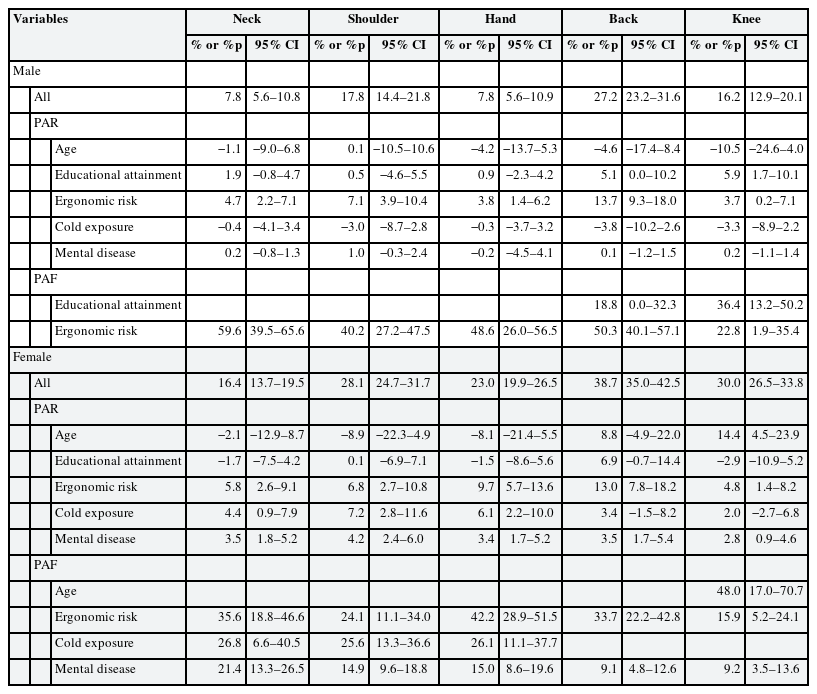 The one-year prevalence of MSD in the neck, shoulder, hand, back, and knee was 7.8%, 17.8%, 7.8%, 27.2%, and 16.2% in males vs. 16.4%, 28.1%, 23.0%, 38.7%, and 30.0% in females, respectively. The ergonomic risk PAF according to the body parts ranged from 22.8%–59.6% in males and 22.8%–50.3% in female. Mental diseases showed a significant PAF for all body parts only among female (PAF 9.1%–21.4%). Cold exposure showed a significant PAF for the neck, shoulder, and hand MSD only among female (25.6%–26.8%). Age was not a significant indicator except for the knee MSD among female.