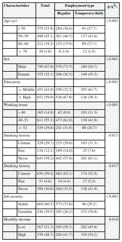 First, the frequencies of participants’ general characteristics (age, sex, education, weekly working hours, smoking history, job stress, and job security) were calculated in the subsamples by employment type; then, these were analyzed with χ