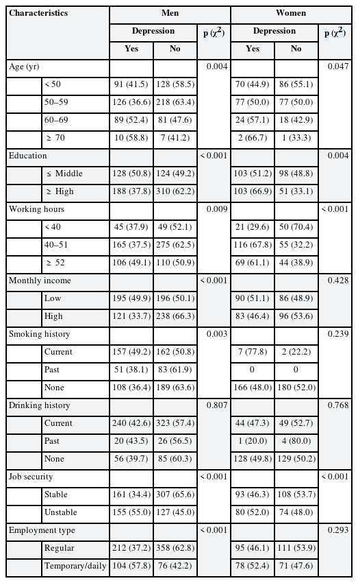 2 tests. Second, the frequency of general characteristics was calculated in the subsamples by sex and CES-D-10 score (i.e., depression and non-depression groups), which were also analyzed with χ