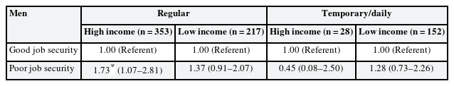 Table 1 shows participants’ demographic and job-related characteristics according to job type. Those who were older (vs. younger), men (vs. women), and more educated (vs. less) were significantly more likely to be regular workers. Regular workers were significantly more likely to be current smokers than temporary/daily workers. Finally, regular workers had significantly higher job security than did temporary/daily workers.