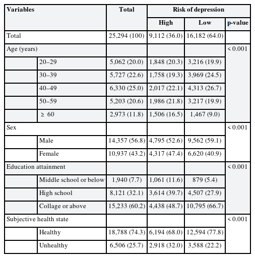 26,29,30 Therefore, in this study, scores below 50 were classified as low risk of depression (“Low”), whereas scores of 50 and above were classified as high risk of depression (“High”).
