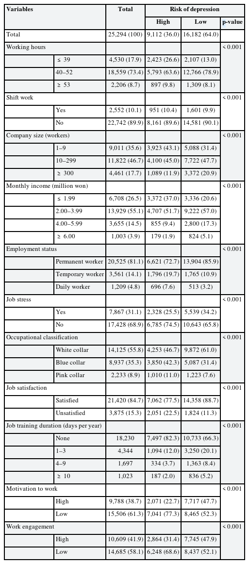 Of the 50,538 individuals surveyed in the KWCS, 17,475 were excluded because they were non-wage workers and another 7,769 were excluded due to non-response to the relevant survey items. Therefore, the final study population consisted of 25,294 individuals (
