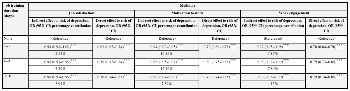 The mediating effect of job satisfaction, motivation to work, and work engagement on the length of job training duration and the risk of depression was evaluated with flexible mediation analysis with weighting-based method, applying logit link function for both mediator and outcome. Standard errors and 95% confidence interval (CI) were calculated by non-parametric bootstrap method with corresponding Wald-type z statistics and p-values.