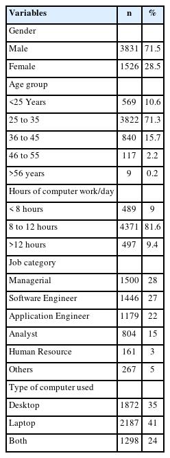 Out of the 6563 reports only 5357 were included as the rest of the data was incomplete. 71.5% of the subjects were male and 28.5% female. The mean age of the male and female subjects was 31.10 ± 5.99 years and 29.68 ± 5.59 years respectively. 41% of the population used laptops, 35% desktops and 24% both. The statistical analysis revealed that the distribution of the use of laptop and desktop was almost similar (Odds Ratio: 1.21, 95% Confidence Interval: 0.70 to 2.1). 81.6% of the population was working for 8 to 12 hours in a day. Demographic characteristics of the population were described in Table
