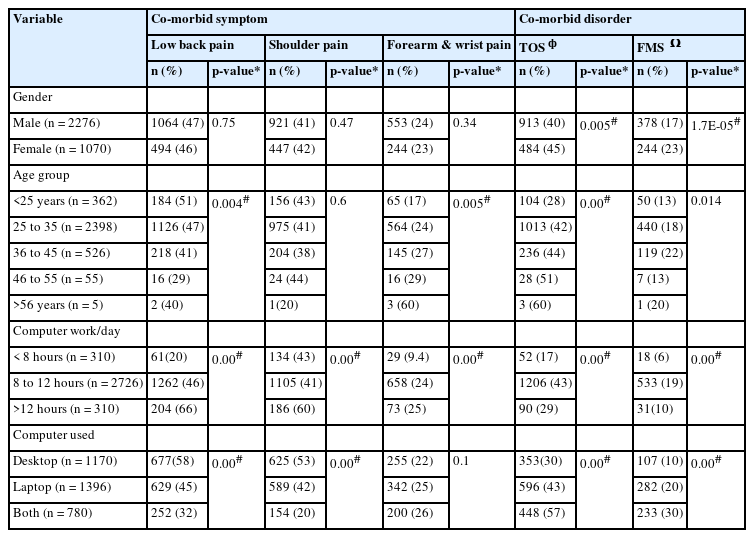 The present study revealed that low back pain, shoulder pain, forearm and wrist pain were co morbid with MNP among the IT professionals in India. There was a strong correlation between these symptoms which was suggestive of awkward posture as a risk factor for WRMSD. Eye strain was found to be the other common co morbid symptom noted among IT professionals with MNP. The study suggested the presence of symptoms in multiple regions with longer working hours, in both genders irrespective of their age and type of computer usage. Low back pain as a co-morbid symptom of neck pain was more common in younger age groups and in subjects who worked for longer hours. Forearm and wrist pain as a co-morbid symptom of neck pain was more common in older age groups and in subjects who worked for longer hours. This is suggestive of static loading as a possible risk factor for low back pain and abnormal posture as a possible risk factor for wrist pain.