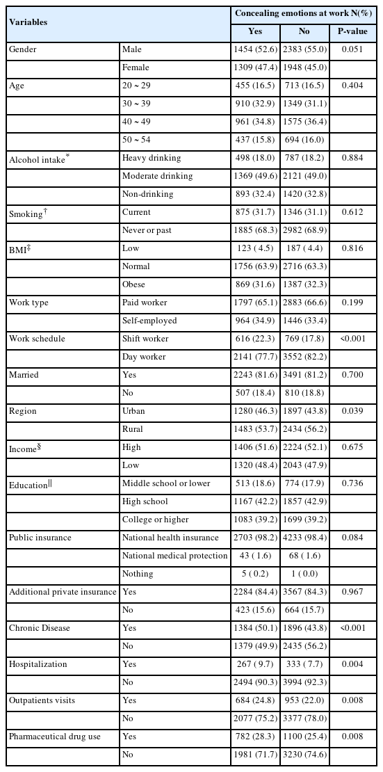 Among those who concealed their emotions (n = 2,763), 47.4% were females, and 50.1% had chronic disease. In addition, 9.7% of the concealing emotions group had been hospitalized within the last year, 24.8% had been outpatients in the last two weeks, and 28.3% had used pharmaceutical drugs in the last two weeks.