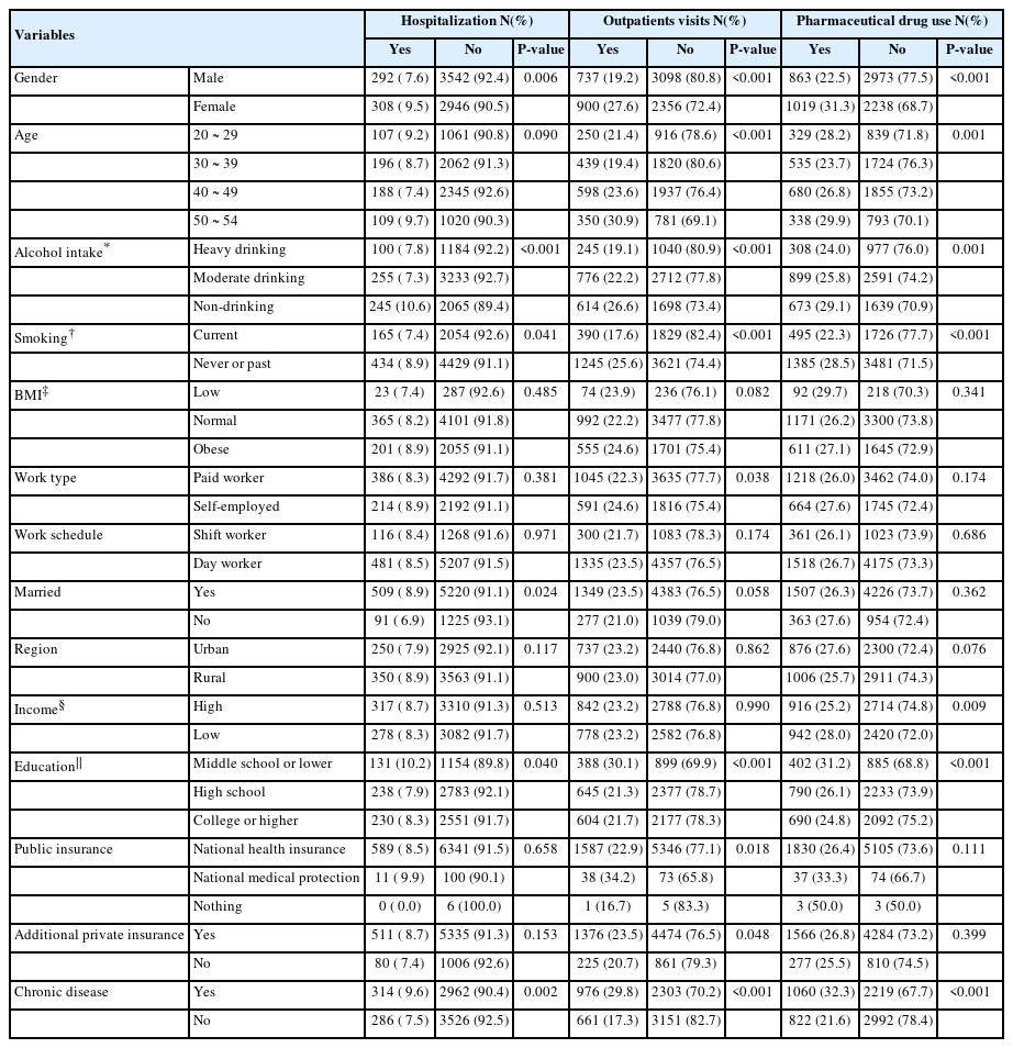 Data from the 2007–2009 4th Korea National Health and Nutrition Examination Survey (KNHANES IV) was used, 7,094 participants (3,837 males, 3,257 females) aged between 20 and 54 who were economically active and completed all necessary questionnaire items were included. Odds ratios (ORs) and 95% confidence intervals (95% CI) for differences in hospitalization, outpatient visits, and pharmaceutical drug use between those who concealed their emotions and those who did not were investigated using logistic regression models with and without gender stratification.