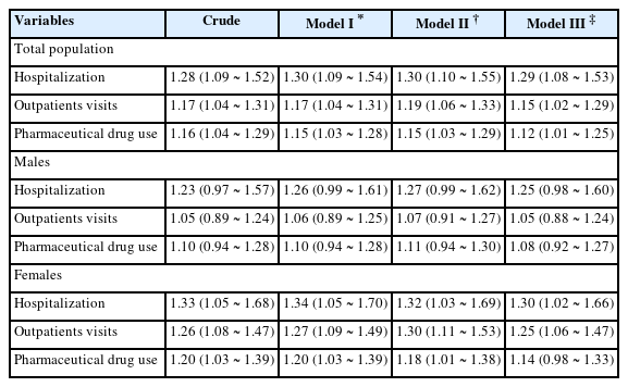 Outpatients visits1.26 (1.08 ~ 1.47)1.27 (1.09 ~ 1.49)1.30 (1.11 ~ 1.53)1.25 (1.06 ~ 1.47)