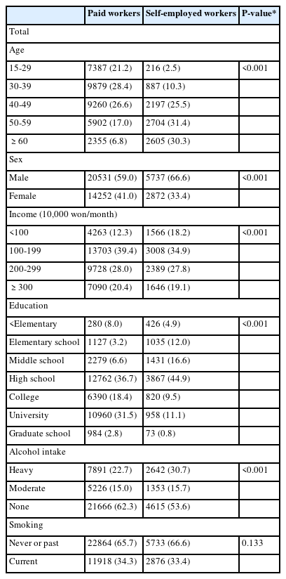 17]. Thus, self-employed workers in this study refer to people who run their own businesses without any other employees are distinguished from paid workers. We included data from 43,392 respondents, excluding 6,509 who were employers, unpaid family workers, or others and 131 who refused provide their average monthly income.