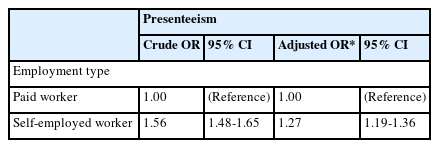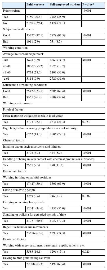 Out of 43,392 respondents, 34,783 were paid workers and 8,609 were self-employed workers. Paid and self-employed workers showed differences in working conditions and environments, and self-employed workers were more likely to exhibit presenteeism than paid workers were (adjusted OR 1.27, 95% CI 1.19 – 1.36).
